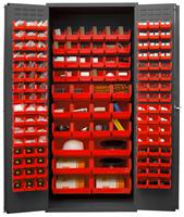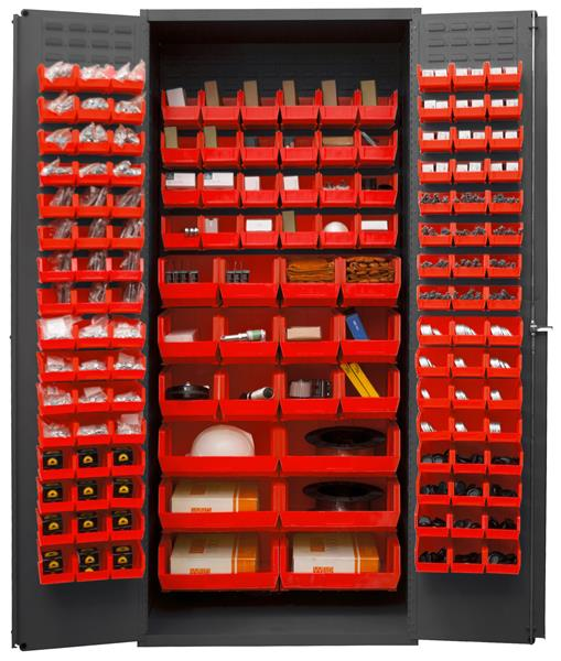 138 red bins. Heavy duty all welded 14 gauge steel. Full height welded piano hinges for increased strength and rigidity of doors. 3-point locking system with chrome keyed handle and 5/16 in. diameter lock rods. Adjustable shelves rest on louver uprights and adjust on 4 in. centers (no tools required). Doors open at 180 degrees for full access. Gray powder coat finish.