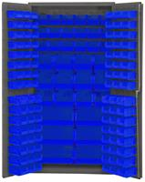 Heavy Duty Cabinet, 132 blue Hook-On-Bins, 3-point locking system with keyed handle and lock rods, flush door style, gray.