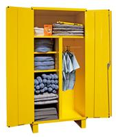 Heavy Duty Spill Control Cabinet with Wardrobe/Broom Storage, lockable, 1 fixed top shelf and 4 adjustable side shelves with hanger bar, yellow. Heavy duty all welded 14 gauge construction. Doors open at 180 degrees. 3-point locking system with keyed handle and 5/16 in. depth. lock rods. Fully welded piano hinges for increased strength and rigidity of doors. Hanger bar for uniforms, jackets, etc. Cabinet ships fully assembled. 6 in. height box style legs. Adjustable shelves have 300 pounds capacity per shelf, fixed shelf will bear up to 900 pounds. Ample space for broom storage. Yellow powder coat finish.