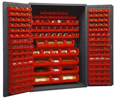 48 in.. Heavy Duty Cabinet, 14 gauge steel, lockable cabinet, with 186 red Hook-On-Bins, flush door style, gray.