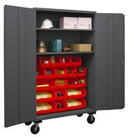 48 in. wide, 14 gauge, lockable mobile cabinet, with 18 red hook-on bins, 2 adjustable shelves, flush door Style. 6 in. x 2 in. phenolic bolt-on casters; 2 swivel and 2 rigid. Shelves are constructed of 14 gauge steel. 3 in. push handle on the side of the cabinet. Durable, gray textured powder coat finish. Perfect for storing, organizing and securing a wide a range of maintenance and replacement items, parts and components in areas such maintenance departments, tools rooms, warehouse garages, job shops.