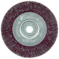 Weiler 4" Polyflex Encapsulated Narrow Face Crimped Wire Wheel Brush features an encapsulation that gradually wears away to expose a consistent short trim for higher aggression, controlled brushing action and longer life. 1/2"-3/8" arbor hole for use on straight grinders, bench/pedestal grinders and buffing lathes. Featuring Weiler's solid ring construction, these radial brushes are available in heat-treated steel, type 302 stainless steel and brass wire for use in a wide variety of applications.