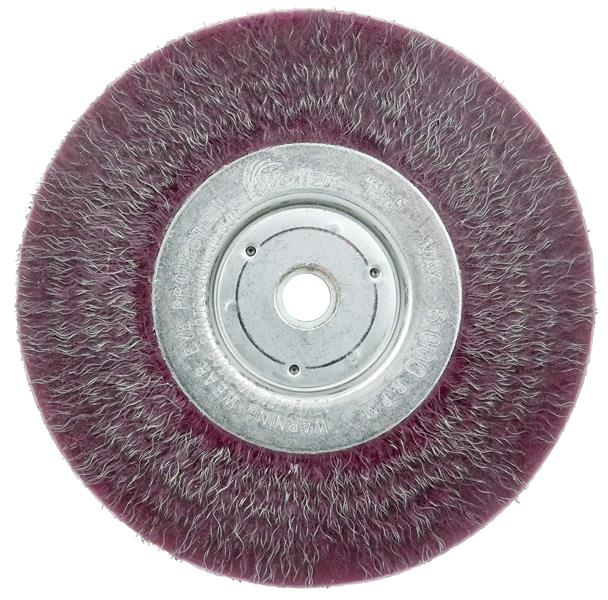 Weiler 6" Polyflex Encapsulated Narrow Face Crimped Wire Wheel Brush features an encapsulation that gradually wears away to expose a consistent short trim for higher aggression, controlled brushing action and longer life. 5/8"-1/2" arbor hole for use on straight grinders, bench/pedestal grinders and buffing lathes. Featuring Weiler's solid ring construction, these radial brushes are available in heat-treated steel, type 302 stainless steel and brass wire for use in a wide variety of applications.