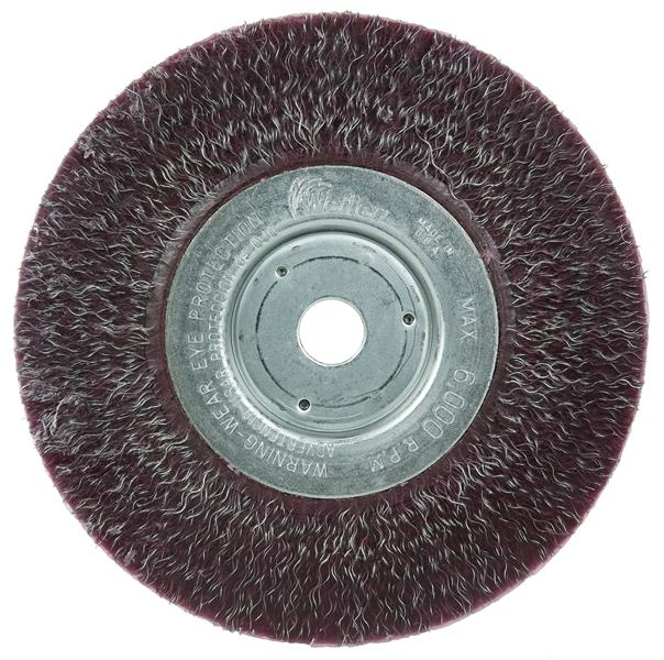 Weiler 6" Polyflex Encapsulated Narrow Face Crimped Wire Wheel Brush features an encapsulation that gradually wears away to expose a consistent short trim for higher aggression, controlled brushing action and longer life. 5/8"-1/2" arbor hole for use on straight grinders, bench/pedestal grinders and buffing lathes. Featuring Weiler's solid ring construction, these radial brushes are available in heat-treated steel, type 302 stainless steel and brass wire for use in a wide variety of applications.