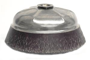 Weiler 4" Polyflex Encapsulated Crimped Wire Cup Brush is ideal for applications on flat surfaces that require maximum aggression but no flexibility in the brushing action. 5/8"-11 threaded nut for use on right angle grinders. The burgundy elastomer gradually wears away exposing consistent short trim for maximum aggression and long-life.