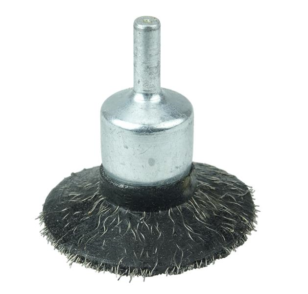 Weiler 2" Polyflex Encapsulated Circular Flared Crimped Wire End Brush features a heat-stabilized black elastomer that gradually wears exposing consistent short trim for maximum aggression and long life. Ideal for applications on flat surfaces that require maximum aggression but no flexibility in the brushing action. 1/4" stem for use on die grinder and right angle air die grinder.