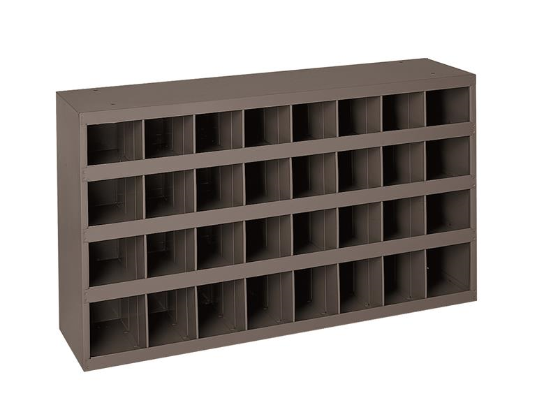 32 Opening Bin. All welded, prime cold rolled steel. Fully hemmed 1-1/8 in. bin fronts to hold labels and retain parts. Roll-formed sides for increased strength and stability. Ribbed and hemmed dividers provide added strength. Newly redesigned slope shelves. Modular with most 12 in. deep bins and drawer cabinets; mounting holes are located in both the top and bottom. Optional doors, base and bin labels available. Gray powder coat finish. Ships fully assembled.
