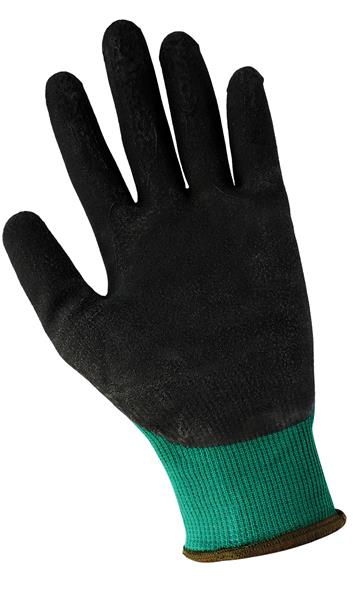 This coated glove features a black foam rubber dip on a dark green nylon shell. This glove is very soft, flexible and lightweight. The knit wrist prevents gloves from slipping off and provides some support for the wrist.