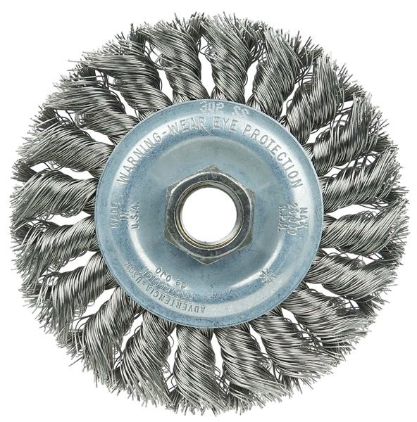 Wolverine 4" Standard Twist Knot Wire Wheel Brush provides an aggressive brushing action for general purpose deburring cleaning and surface preparation applications. Featuring Weiler individual knot hole construction, these radial brushes are available in heat-treated steel, type 302 stainless steel and bronze wire for use in a wide variety of applications. 5/8"-11 nut for use on right angle grinders.