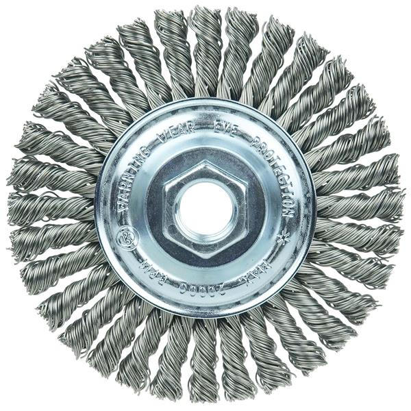Wolverine 4" Stringer Bead Twist Knot Wire Wheel Brush is suitable for cleaning root and hot passes and reaching into corners. Engineered for cost effective use in less demanding applications. 5/8"-11 nut for use on right angle grinders.