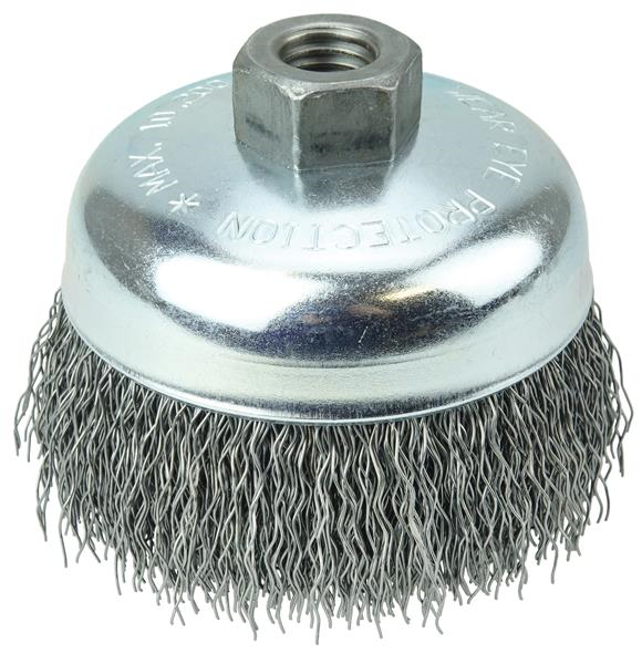 Wolverine 4" Crimped Wire Cup Brush provides flexible brushing action and cost effective performance in general purpose cleaning applications. 5/8"-11 nut for use on right angle grinders.