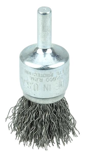 Wolverine 3/4" Crimped Wire End Brush features solid end construction and flexible brushing action. Engineered to provide cost-effective use for less demanding applications. 1/4" stem diameter for use on die grinder, drill and drill presses.