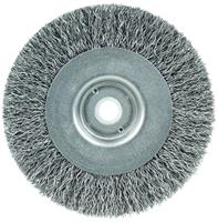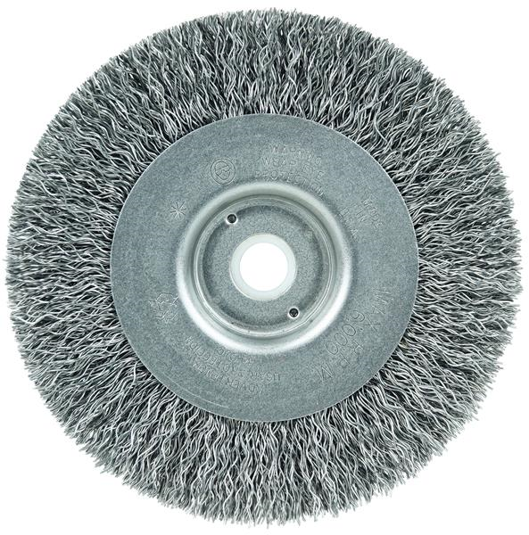 Wolverine 4" Narrow Face Crimped Wire Wheel Brush provides a flexible brushing action and cost-effective performance in general purpose cleaning and deburring applications. Featuring Weiler'solid ring construction, these radial brushes are available in heat-treated steel, type 302 stainless steel and brass wire for use in a wide variety of applications. 1/2"-3/8" arbor hole for use on bench/pedestal grinders.