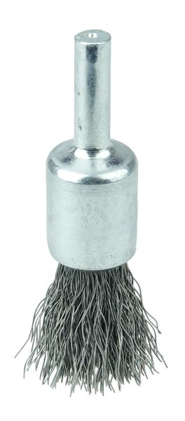 Wolverine 1/2" Crimped Wire End Brush features solid end construction and flexible brushing action. Engineered to provide cost-effective use for less demanding applications. 1/4" stem diameter for use on die grinder, drill and drill presses.