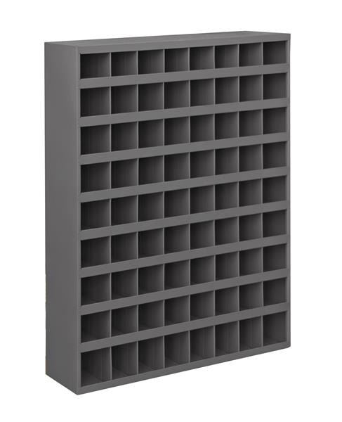 72 Opening Bin. All welded, prime cold rolled steel. Fully hemmed 1-1/8 in. bin fronts to hold labels and retain parts. Roll-formed sides for increased strength and stability. Ribbed and hemmed dividers provide added strength. Newly redesigned slope shelves. Modular with most 12 in. deep bins and drawer cabinets; mounting holes are located in both the top and bottom. Optional doors, base and bin labels available. Gray powder coat finish. Ships fully assembled.