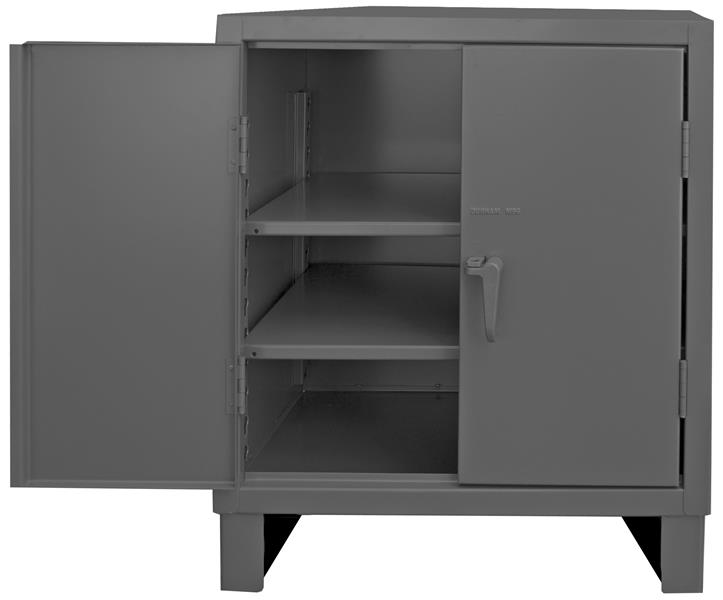 Heavy Duty Cabinet, 14 gauge, 1 fixed shelf and 2 adjustable shelves, recessed door style, gray. All cabinets are 24 in. deep. Flush doors with 7 gauge leaf hinges to prevent sagging. 3-point cast steel locking handle with 3/8 in. diameter rods and provisions for a padlock (padlock not provided). 6 in. height base/legs which provide access for forklifts; pre-drilled holes allow for lagging to the floor. (constructed of 3/16 in. steel). Cabinet ships fully assembled. Shelves bolt into place easily using fasteners provided and adjust on 2-1/4 in. centers.