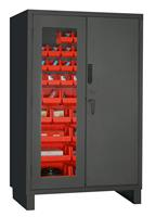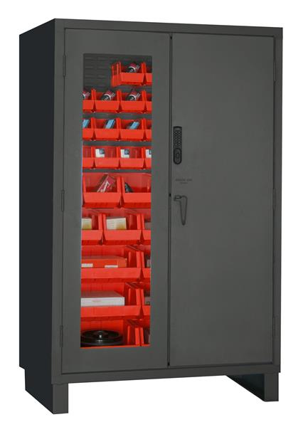 48 in. wide, Heavy Duty Electronic Access Control Cabinet, electronic lock and audit trail software with 42 red Hook-On-Bins, 1 clear door, flush door style, gray.