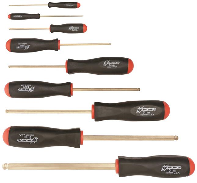 Ball End Tip Hex Screwdriver Set of 9 Pieces with GoldGuard Plated Finish. Set Includes Sizes: 1.5mm, 2mm, 2.5mm, 3mm, 4mm, 5mm, 6mm, 8mm & 10mm