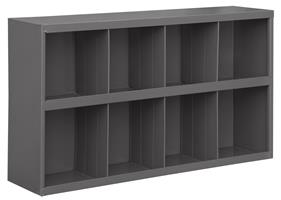 8 Opening Bin. All parts bin cabinet welded, prime cold rolled steel. Fully hemmed 1-1/8 in. bin fronts to hold labels and retain parts. Roll-formed sides for increased strength and stability. Modular with all other 9 in. deep bins. Mounting holes are located in both the top and bottom. Gray powder coat finish. Ships fully assembled.