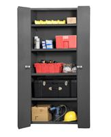 Heavy Duty Space Saving Cabinet, lockable cabinet, 1 fixed shelf and 4 adjustable shelves, bi-fold door style, gray. Standard doors on a 36 in. cabinet swing out 18 in. while the Durham bi-fold door swings out a maximum of 9 in.. Adjustable shelves rest on louver uprights and adjust on 4 in. centers (no tools required). Perfect for tighter areas where most cabinets would not fit. Magnets are included to keep doors in the open folded position. Ultimate security features 8-point locking system. Two padlockable handles with four lock rods each ensure safety and security of items inside the cabinet.