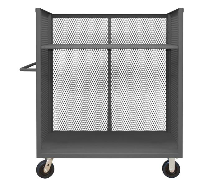3 Sided Mesh Truck with 6 in. x 2 in. Polyurethane casters, (2) rigid and (2) swivel, (2) fixed shelves and tubular push handle. 3,600 lb. capacity.