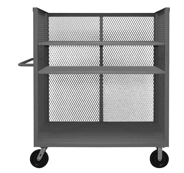 3 Sided Mesh Truck with 6 in. x 2 in. Phenolic casters, (2) rigid and (2) swivel, 3 shelves and tubular push handle. 3,000 lb. capacity.