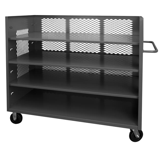 3 Sided Mesh Truck with 6 in. x 2 in. Phenolic casters, (2) rigid, (2) swivel, 4 shelves, (3) adjustable and tubular push handle. 2,000 lb. capacity.
