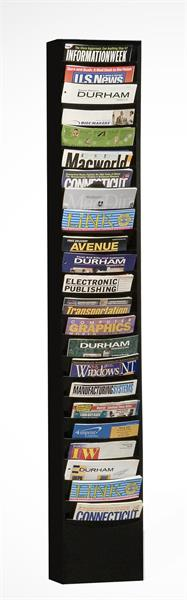 23 Pockets. Prime cold rolled all steel construction. Exclusive Con-Tur design which eliminates paper curl. Each pocket holds up to 150 sheets of 8-1/2 in. x 11 in. paper. When displaying standard 8-1/2 in. x 11 in. literature, the top 2-1/2 in. are visible. Keyhole slots in the back make wall mounting easy. Base to make units free standing and Dura-Hang brackets to allow hanging on office partitions are available as accessories. Ships fully assembled ready for use. Durable black powder coat finish.