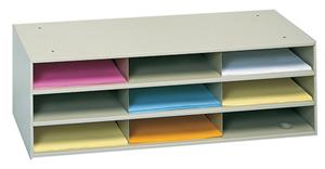 9 Opening horizontal literature rack. Prime cold rolled steel has a powder coated finish and is rust and acid resistant. Provides sturdy convenient storage for literature up to 11 in. width by 11-5/8 in. depth. Will accommodate standard file folders without bending tabs. Each opening is 3 in. high. Openings can be easily labeled on 1/2 in. high front turns. Perfect for use on desktops and countertops or stacking on the floor. Modular and can be easily combined with other Horizontal Literature Racks and Mail Centers using pre-punched holes and fasteners provided. Rubber feet are included. Ships fully assembled. Tan color.