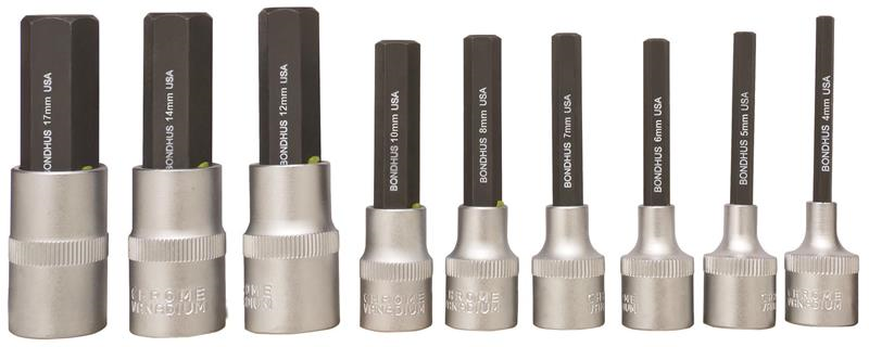 ProHold Socket Hex Bit 9 Piece Tool Set, with Sockets - 2" Length. Includes sizes: 4mm, 5mm, 6mm, 7mm, 8mm, 10mm, 12mm, 14mm & 17mm. With ProHold Button Technology. Protanium High Torque Steel and ProGuard™ corrosion resistant finish. Packaged in transparent clamshell.