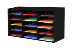 15 Opening horizontal literature rack. Prime cold rolled steel has a powder coated finish and is rust and acid resistant. Provides sturdy convenient storage for literature up to 11 in. width by 11-5/8 in. depth. Will accommodate standard file folders without bending tabs. Each opening is 3 in. high. Openings can be easily labeled on 1/2 in. high front turns. Perfect for use on desktops and countertops or stacking on the floor. Modular and can be easily combined with other Horizontal Literature Racks and Mail Centers using pre-punched holes and fasteners provided. Rubber feet are included. Ships fully assembled. Black color.