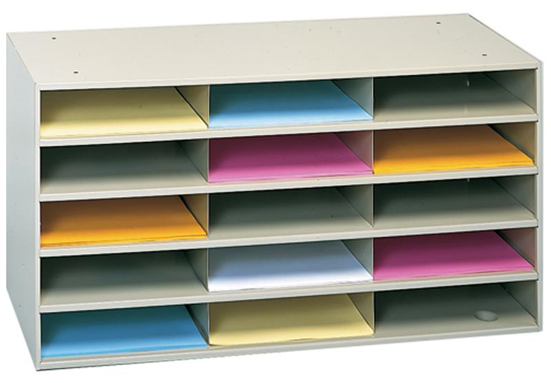 15 Opening horizontal literature rack. Prime cold rolled steel has a powder coated finish and is rust and acid resistant. Provides sturdy convenient storage for literature up to 11 in. width by 11-5/8 in. depth. Will accommodate standard file folders without bending tabs. Each opening is 3 in. high. Openings can be easily labeled on 1/2 in. high front turns. Perfect for use on desktops and countertops or stacking on the floor. Modular and can be easily combined with other Horizontal Literature Racks and Mail Centers using pre-punched holes and fasteners provided. Rubber feet are included. Ships fully assembled. Black color.