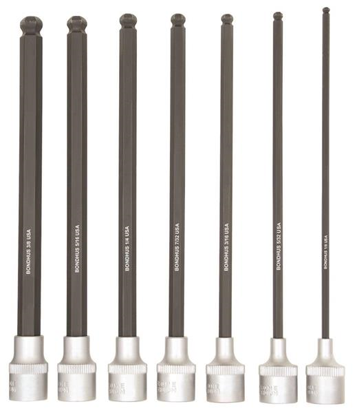 ProHold Socket Ball End Bit 7 Piece Tool Set, with Sockets - 6" Length. Includes sizes: 1/8", 5/32", 3/16", 7/32", 1/4", 5/16" & 3/8". With ProHold Button Technology. Protanium High Torque Steel and ProGuard™ corrosion resistant finish. Packaged in transparent clamshell.