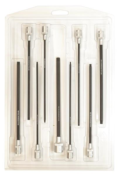 ProHold Socket TORX Bit Set of 9 Pieces, with sockets. Length: 6". Set includes sizes: T8, T9, T10, T15, T20, T25, T27, T30 & T40. With ProHold Button Technology. Protanium High Torque Steel and ProGuard™ corrosion resistant finish.
