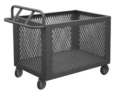4 Sided Mesh Box Truck with 5" x 1-1/4" Polyurethane casters, (2) rigid and (2) swivel with side brakes, 1 shelf and ergonomic tubular push handle, gray