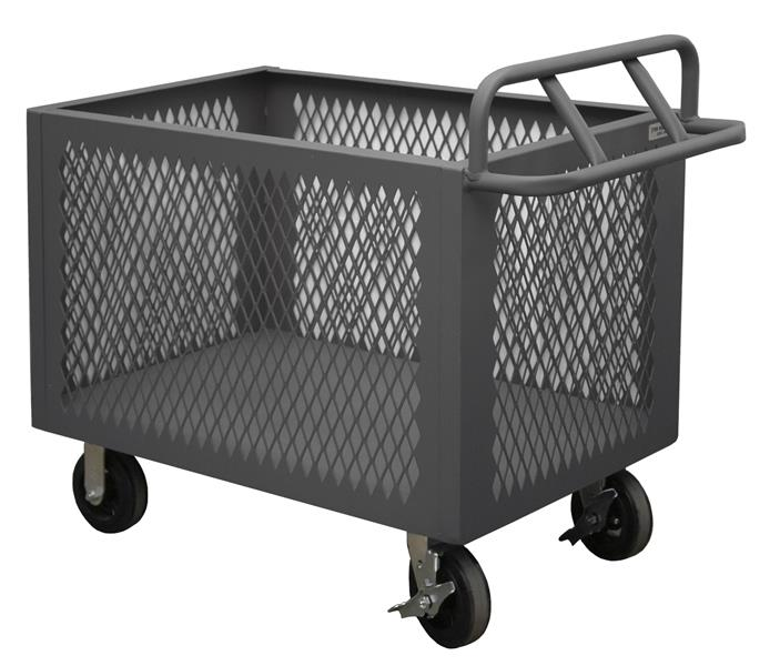 4 Sided Mesh Box Truck with 6" x 2" Phenolic casters, (2) rigid and (2) swivel with side brakes, 1 shelf and ergonomic tubular push handle, gray