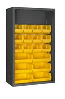 36 in. wide,12 gauge extra heavy duty enclosed shelving unit with 18 yellow bins. Choose from 36,48,60, and 72 in. wide. Hook on bins rest easily on louvered panel. Provisions for shelves allow you to add shelving. Ships fully assembled and ready for use. Durable, textured, gray powder coat finish. Stores tools, dies, parts, supplies and a wide range of items in areas such as garages, warehouses and manufacturing facilities.