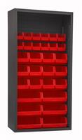 36 in. wide,12 gauge extra heavy duty enclosed shelving unit with 30 red bins. Choose from 36,48,60, and 72 in. wide. Hook on bins rest easily on louvered panel. Provisions for shelves allow you to add shelving. Ships fully assembled and ready for use. Durable, textured, gray powder coat finish. Stores tools, dies, parts, supplies and a wide range of items in areas such as garages, warehouses and manufacturing facilities.