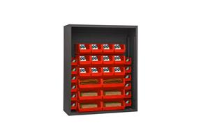 48 in. wide,12 gauge extra heavy duty enclosed shelving unit with 30 red bins. Choose from 36,48,60, and 72 in. wide. Hook on bins rest easily on louvered panel. Provisions for shelves allow you to add shelving. Ships fully assembled and ready for use. Durable, textured, gray powder coat finish. Stores tools, dies, parts, supplies and a wide range of items in areas such as garages, warehouses and manufacturing facilities.