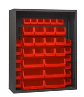 48 in. wide,12 gauge extra heavy duty enclosed shelving unit with 42 red bins. Choose from 36,48,60, and 72 in. wide. Hook on bins rest easily on louvered panel. Provisions for shelves allow you to add shelving. Ships fully assembled and ready for use. Durable, textured, gray powder coat finish. Stores tools, dies, parts, supplies and a wide range of items in areas such as garages, warehouses and manufacturing facilities.