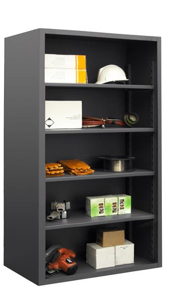 Durham heavy duty 12 gauge enclosed shelving are made with extra heavy duty all welded 12 gauge steel construction, 14 gauge heavy duty shelves. Shelves bolt into place easily using fasteners provided and adjust on 2-1/4? centers. Ships fully assembled and ready for use. Durable, textured, Gray powder coat finish.