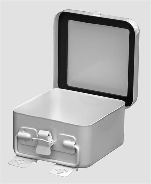 Durable drawn metal cover and body. Cover is welded to body using a full piano hinge with a rust resistant hinge pin and holds 6 standard prepackaged first aid units. Unit meets rigid government specifications. Cover opens 90 degrees for use as a shelf and one piece cover gasket is included and keeps moisture out. Positive pull-down catch and convenient carrying handle with wall mounting hangers with keyhole slots. Sold without contents. Finished with a durable white powder coat finish.