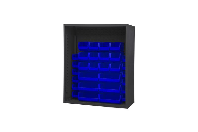 48 in. wide,12 gauge extra heavy duty enclosed shelving unit with 30 blue bins. Choose from 36,48,60, and 72 in. wide. Hook on bins rest easily on louvered panel. Provisions for shelves allow you to add shelving. Ships fully assembled and ready for use. Durable, textured, gray powder coat finish. Stores tools, dies, parts, supplies and a wide range of items in areas such as garages, warehouses and manufacturing facilities.