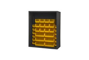 36 in. wide,12 gauge extra heavy duty enclosed shelving unit with 30 yellow bins. Choose from 36,48,60, and 72 in. wide. Hook on bins rest easily on louvered panel. Provisions for shelves allow you to add shelving. Ships fully assembled and ready for use. Durable, textured, gray powder coat finish. Stores tools, dies, parts, supplies and a wide range of items in areas such as garages, warehouses and manufacturing facilities.