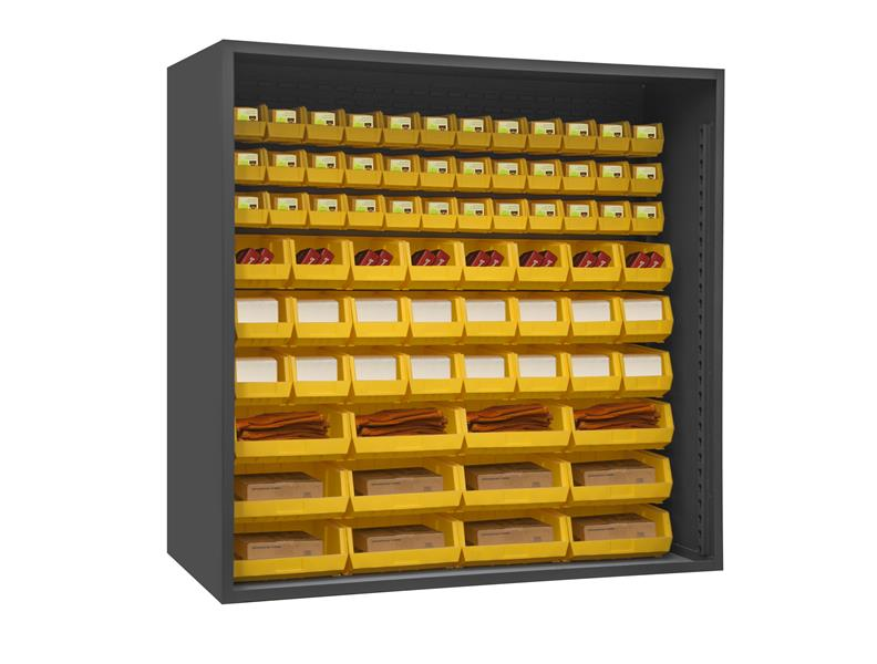 72 in. wide,12 gauge extra heavy duty enclosed shelving unit with 72 yellow bins. Choose from 36,48,60, and 72 in. wide. Hook on bins rest easily on louvered panel. Provisions for shelves allow you to add shelving. Ships fully assembled and ready for use. Durable, textured, gray powder coat finish. Stores tools, dies, parts, supplies and a wide range of items in areas such as garages, warehouses and manufacturing facilities.