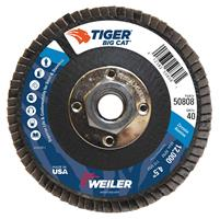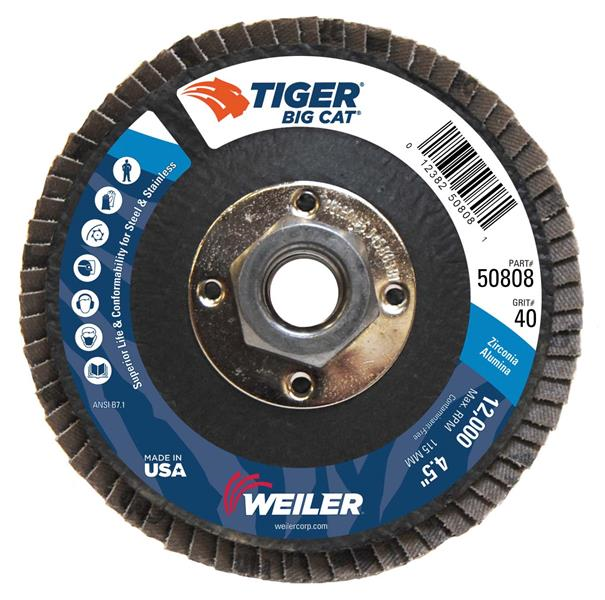 Tiger Big Cat 4.5 inch type 27 high density flap discs offer the widest footprint in the industry for grinding steel and stainless steel. The wider flaps in combination with the thicker high density profile conforms to curved and irregular surfaces better, producing a consistent finish and lasting 30-40% longer than a standard density flap disc.