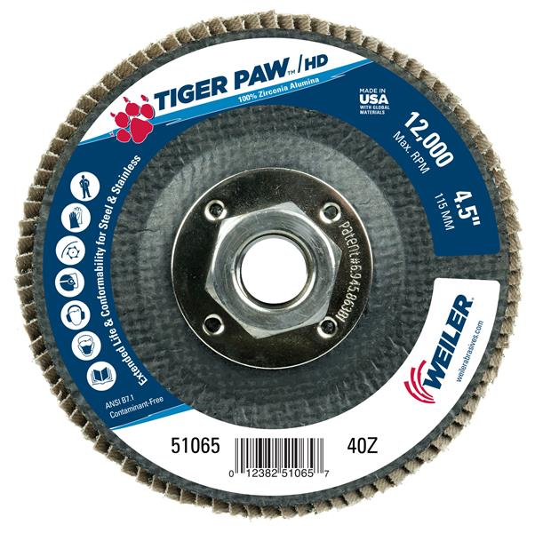 Tiger Paw 4.5 inch high density flap discs are designed for demanding metalworking applications like edge grinding on steel and stainless steel. Tiger Paw leverages 100% zirconia alumina grain that holds up under high temperatures and extreme pressure delivering high performance on heavy duty applications.