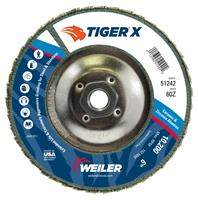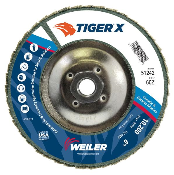 Tiger X 6 inch conical flap discs are designed for aggressive grinding and long life when used on steel and stainless steel. Tiger X holds nothing back with its industry-first X3 technology that combines an advanced anchoring system, dual flap design and engineered backing. The combination delivers fast grinding AND long disc life for increased productivity.