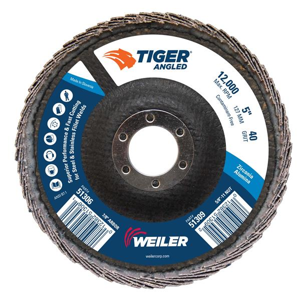 5 in. 40 Grit Zirconia Alumina (40Z) 7/8" Arbor Hole Tiger Angled (Radial) Zirc Flap Disc