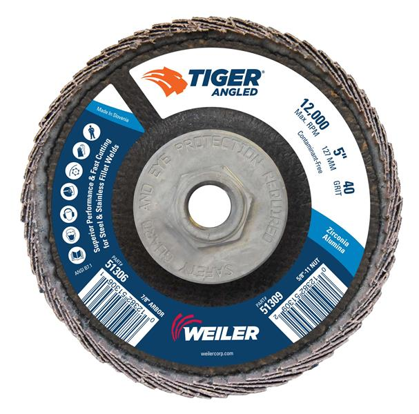 5 in. 40 Grit Zirconia Alumina (40Z) 5/8"-11 Nut Tiger Angled (Radial) Zirc Flap Disc